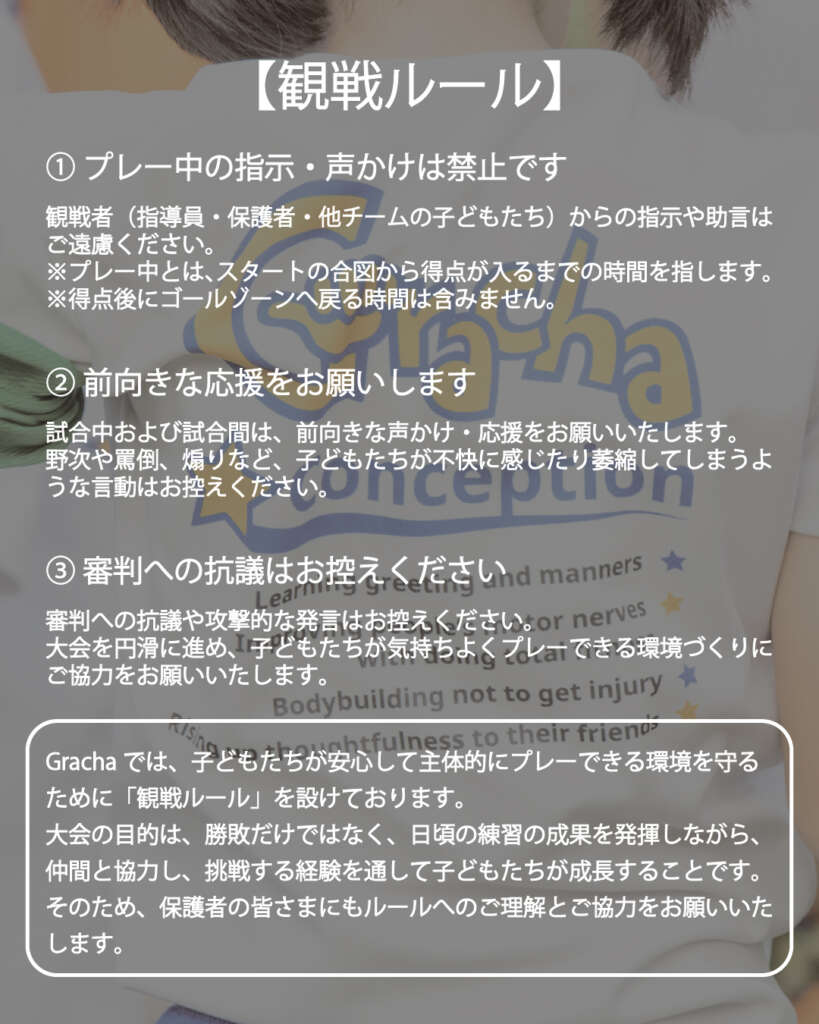 グラッチャ鬼ごっこ大会では、子どもたちが安心して主体的にプレーできる環境を守るために「観戦ルール」を設けております。